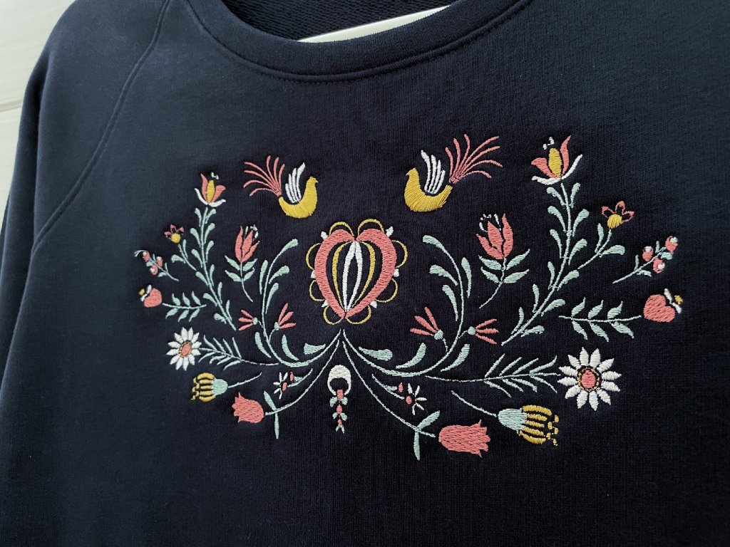 Nádherné mikonošaty v tmavě modré barvě s výšivkou. Ty prostě musíte mít! Jsou fakt pohodlné a příjemné na dotek. Motiv je moje autorská kresba, ale tentokrát jsem jako základ vyhrabošila (vlastně moje mamka) staré kresby po prababičce Božence. Ta pochází ze Slovenska, ale celý život žila v Česku a to taky řádně procestovala. Takže folklorní motiv napříč celým Československem. Má to pro mě velkou symboliku a myslím, že je to krásné snoubení dvou (tak vzdálených) generací. A jako bonus motiv vyšívají moji rodiče v rodinné firmě v jižních Čechách.
